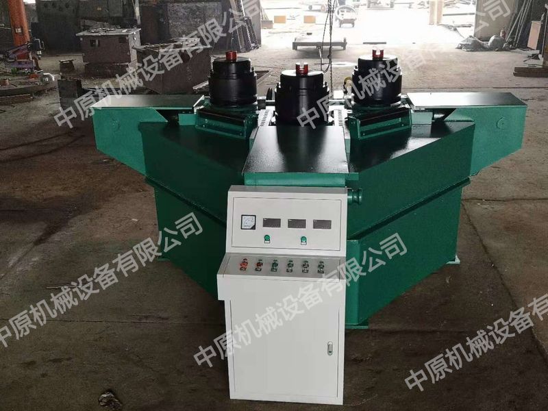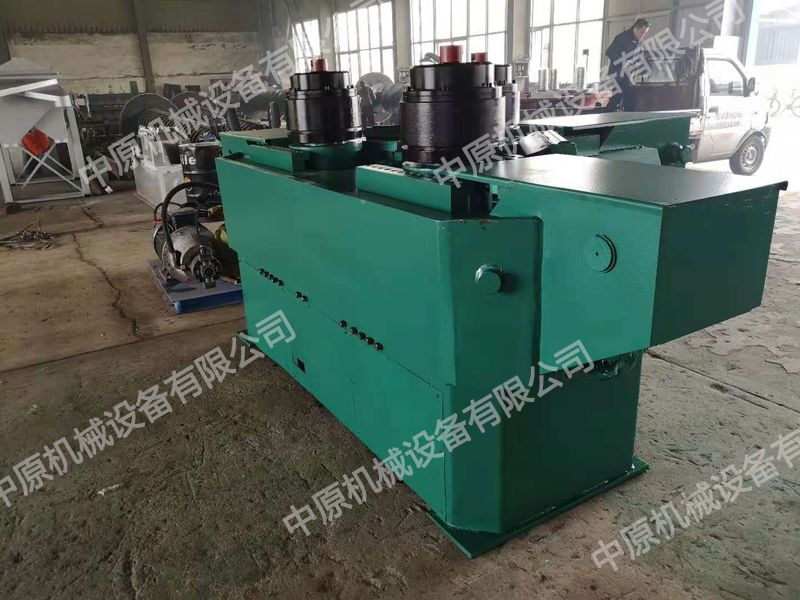 該機為叁輥型材卷圓機,集機電一體。電機輸出的較高轉速通過傳動裝置(聯軸器,液壓馬達,液壓油缸,齒輪等)轉換成所需的大扭矩低轉速,帶動兩主動輥實現旋轉運動,為型材行走提供扭矩。兩個主動輥中心距可調,被動輥通過液壓油缸前進、后退實現位移,來控制直徑大小。三個工作輥成等腰三角形分布,通過調整移動輥實現這三個點形成的弧線達到所需彎曲半徑,借助被動輥的壓緊及兩主動輥的旋轉運動,使型材經過多次連續彎曲,產生永久性塑性變形,用于常溫狀態下將型材卷制成圓形,弧形等工件。