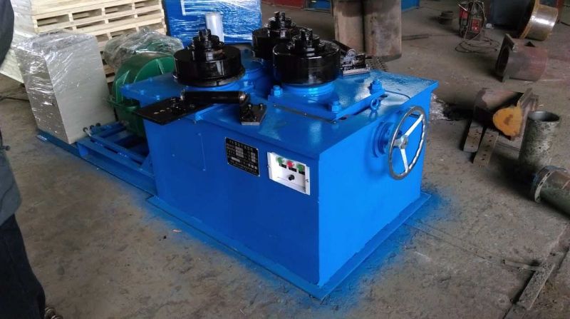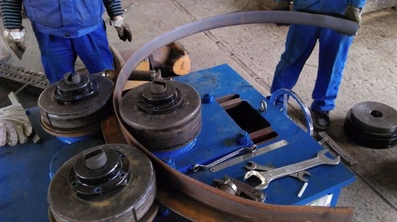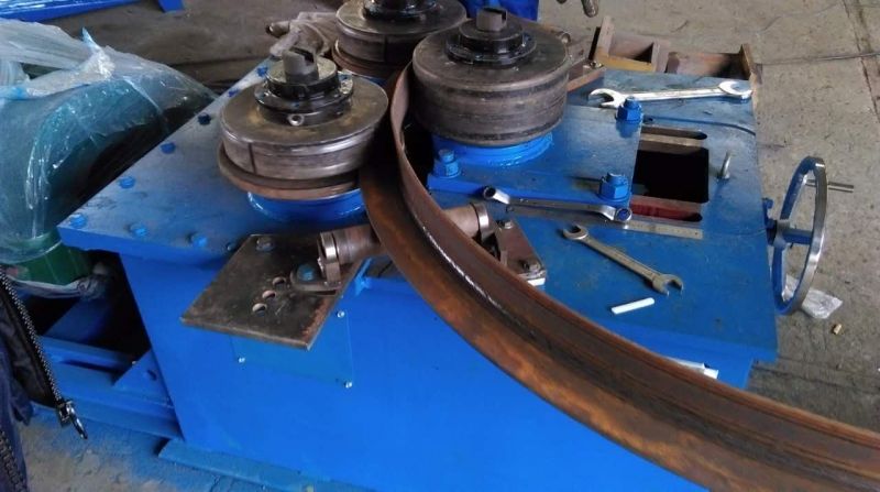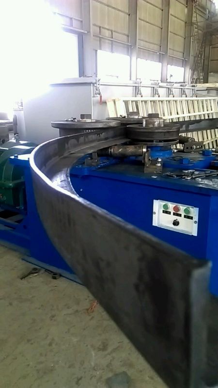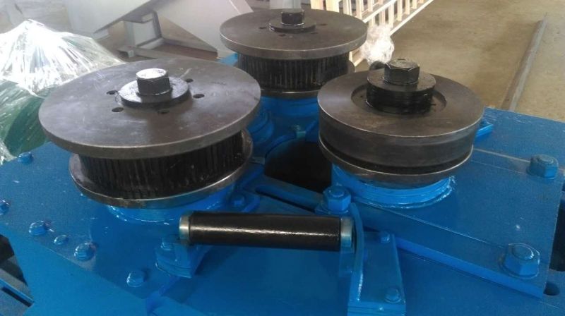 F6型卷圓機是對稱式三輥型材卷圓機,集機電一體,將電動機輸出的較高轉速通過傳動裝置、聯(lián)軸器、減速機、齒輪等轉換為所需的大轉矩低轉速,帶動位置固定的兩主動輥實現(xiàn)旋轉運動,為型材行走提供扭矩。被動輥通過手輪前進、后退實現(xiàn)位移,為卷制型材提供所需的加壓力,位移量由數(shù)字標尺實時顯示。三個工作輥成等腰三角形分布,通過移動被動輥位置實現(xiàn)這三個點形成的弧線達到所需彎曲半徑,即調整所彎型材的曲率。借助被動輥的壓緊及兩主動輥的旋轉運動,使型材經過多道次連續(xù)彎曲,產生永久性的塑性變形,用于常溫狀態(tài)下將型材卷制成圓形、弧形、螺旋形等工件。